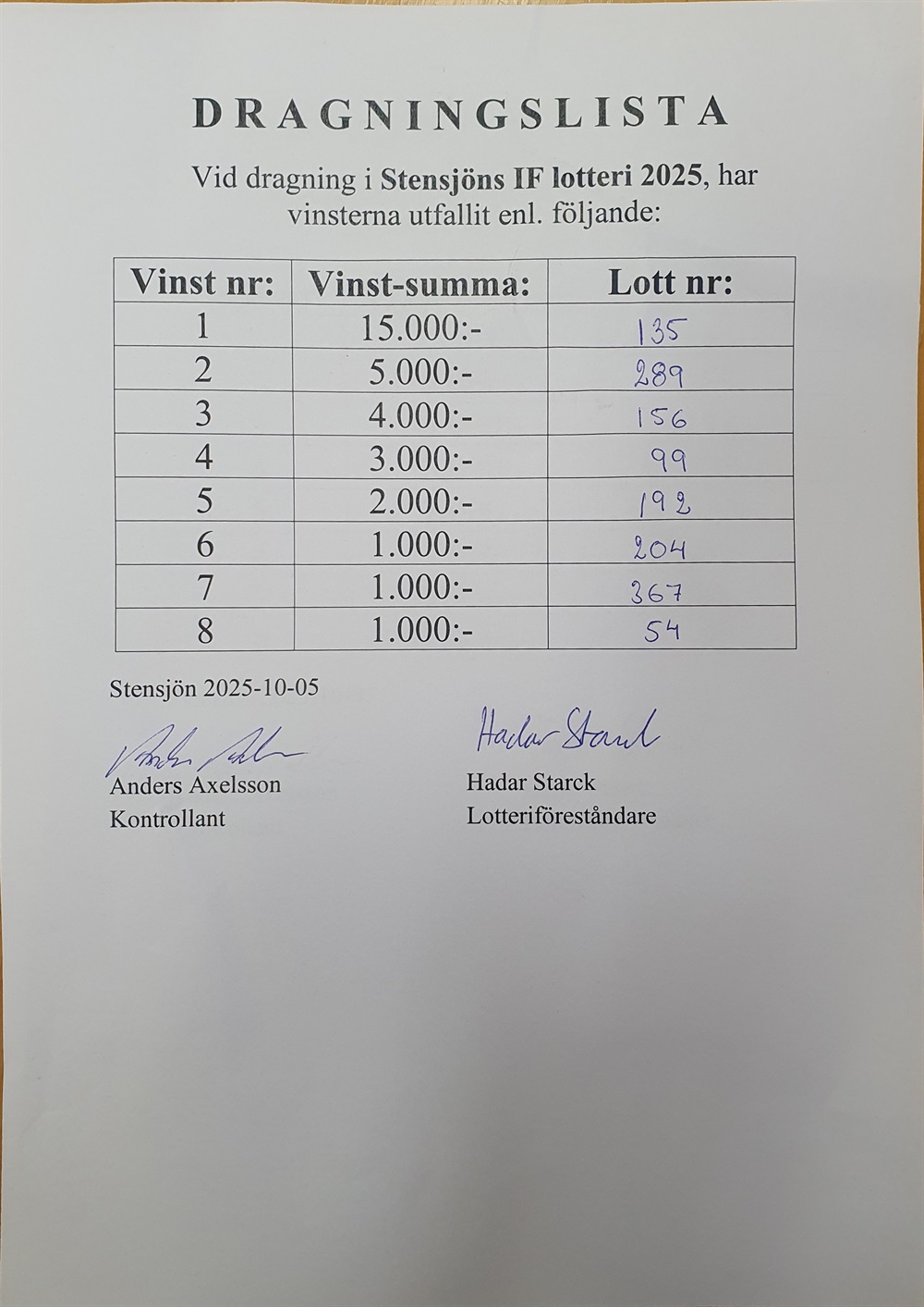 Stort grattis till alla vinnare i Stensjön IFs stora lotteriet 2025.